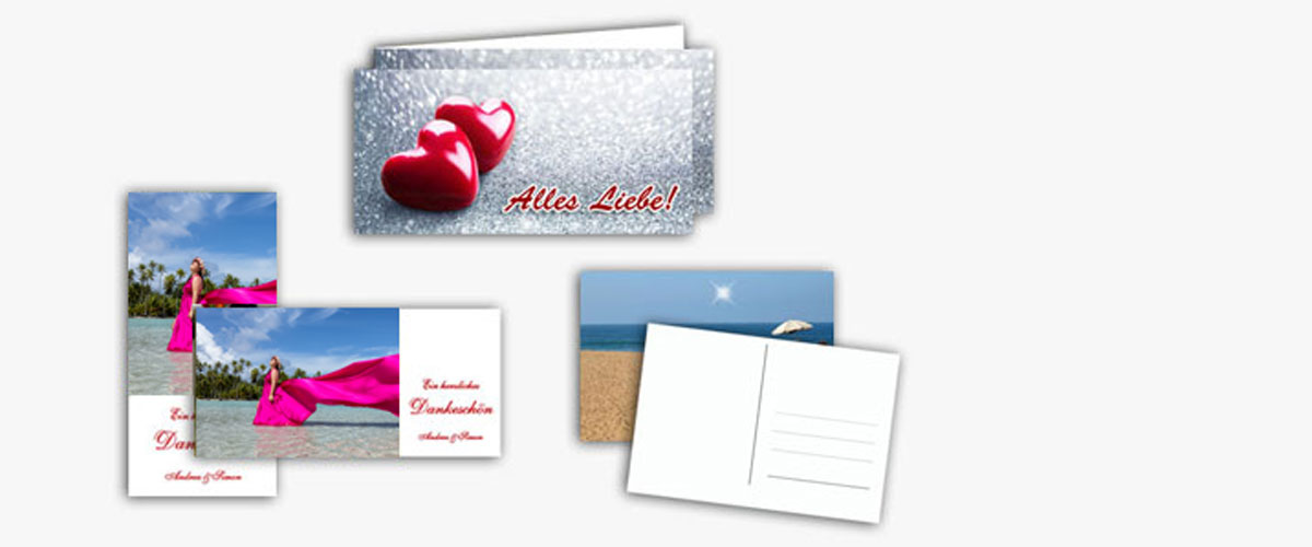 Gestalten Sie Postkarten mit unserer Bestellsoftware doch einmal selbst und sorgen Sie mit einer persönlichen Einladungskarte für individuelles Flair. Wir drucken Postkarten, Grußkarten, Hochzeitskarten oder Einladungen. Egal für welchen Anlass, ob für Hochzeit oder Taufe, Kindergeburtstag oder Kommunion, Jubiläum oder Jugendweihefeiern, mit einer Postkarte als Einladung überzeugen Sie Ihre Gäste schon bevor die Feier losgeht.
